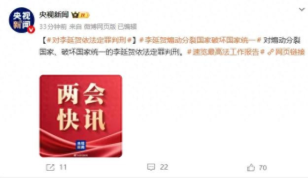 据央视新闻音讯,最高法证实说起,对挑动分辩国度、松弛国度颐养的李延贺照章定罪判刑。